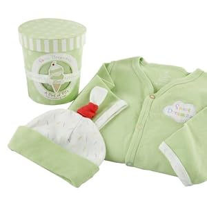 How sweet and dreamy! Baby Aspen brings you the baby gift of choice for anyone with extraordinary taste. As unique as it's adorable, this two-piece bedtime gift set has everything, such as cherry on top! Simple snaps open and close PJ's. Night cap is white with Pj's matching trim, decorated with sprinkles and topped which has a red cherry. Scrumptious hat and footed pajamas are made of machine-washable, 100% cotton. Available in dimensions 0-6 month. Ice cream pint gift box coordinates with the color of PJ's inside, decorated with circles and Z's, a white-striped awning round the lid, a round, clear picture window surrounded by what "Sweet Dreamzzz" and "A Pint of PJ's and matching cap," all encircled by the white ribbon imprinted with Z's with an adorable ice cream-cone appliqué that includes a slumbering baby wearing a cap like the one in the container and also the name of the flavor. Pint-sized gift box measures 4 ½" h x 4 ¼" in diameter